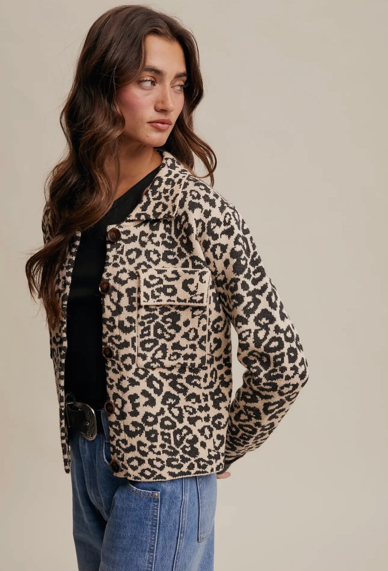 "Get ready to cozy up in our Leopard Knit Jacket! Made with super soft material, this one-of-a-kind piece features convenient pockets for all your essentials. Perfect as a gift or for treating yourself. Stay stylish and comfortable all winter long!